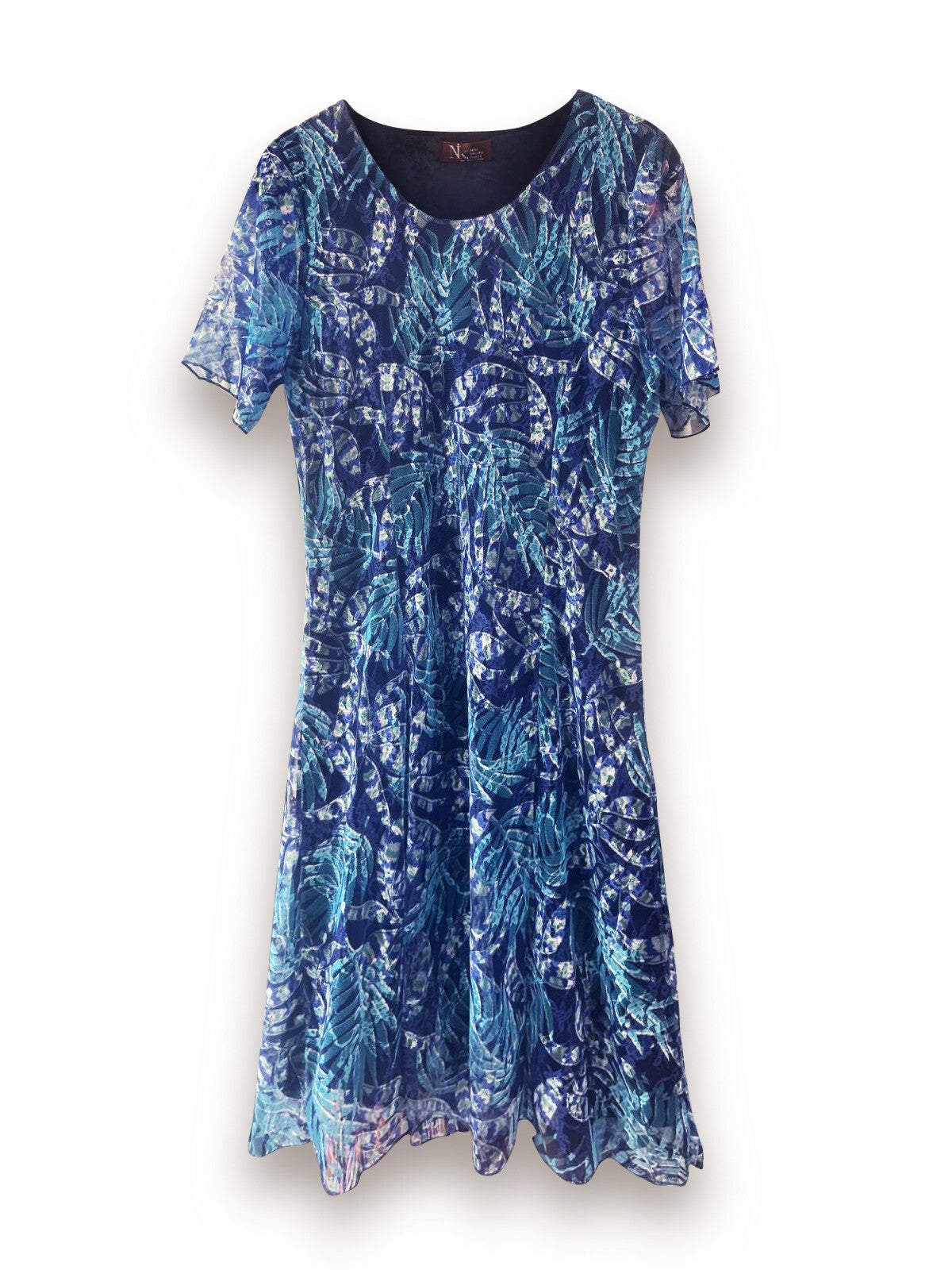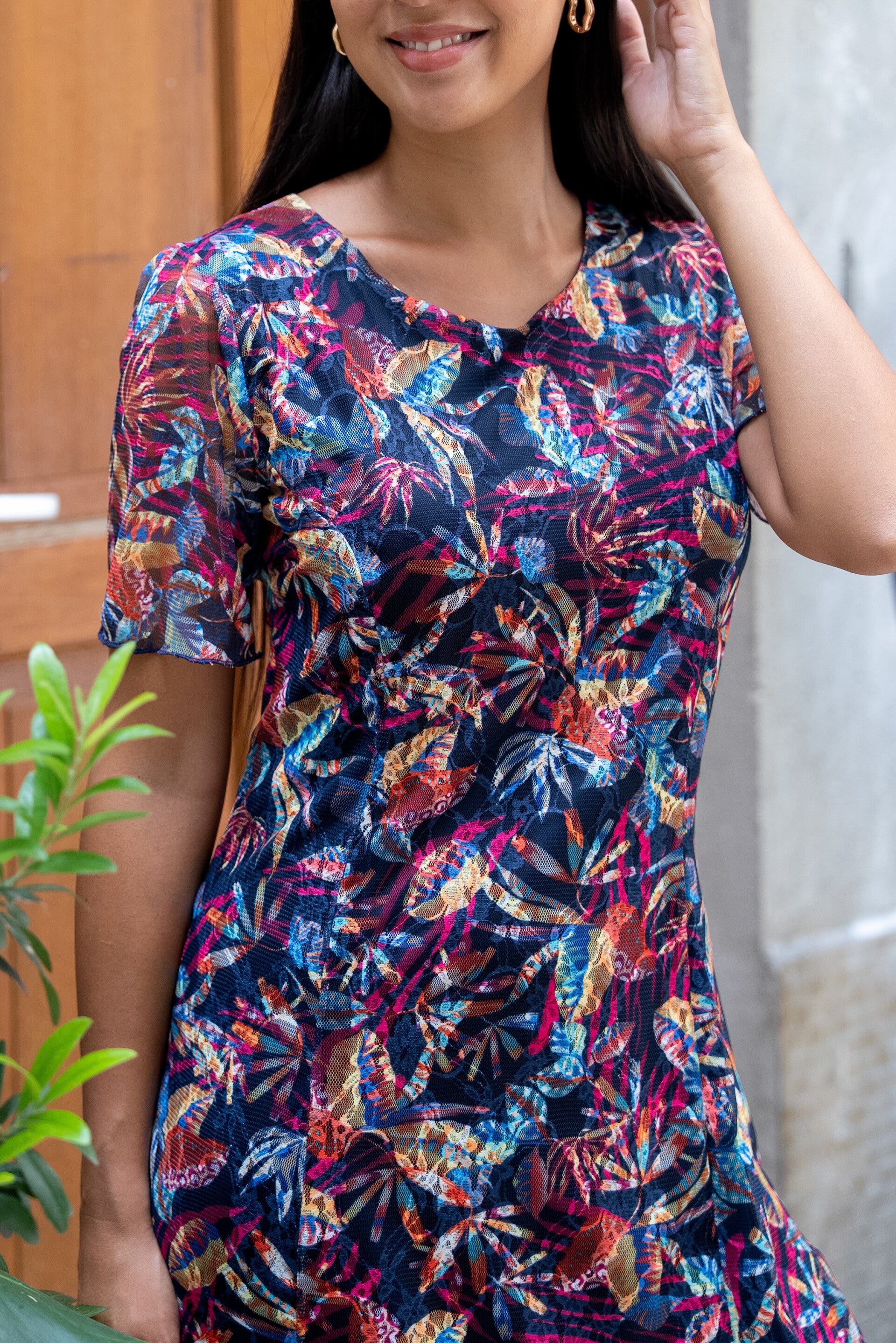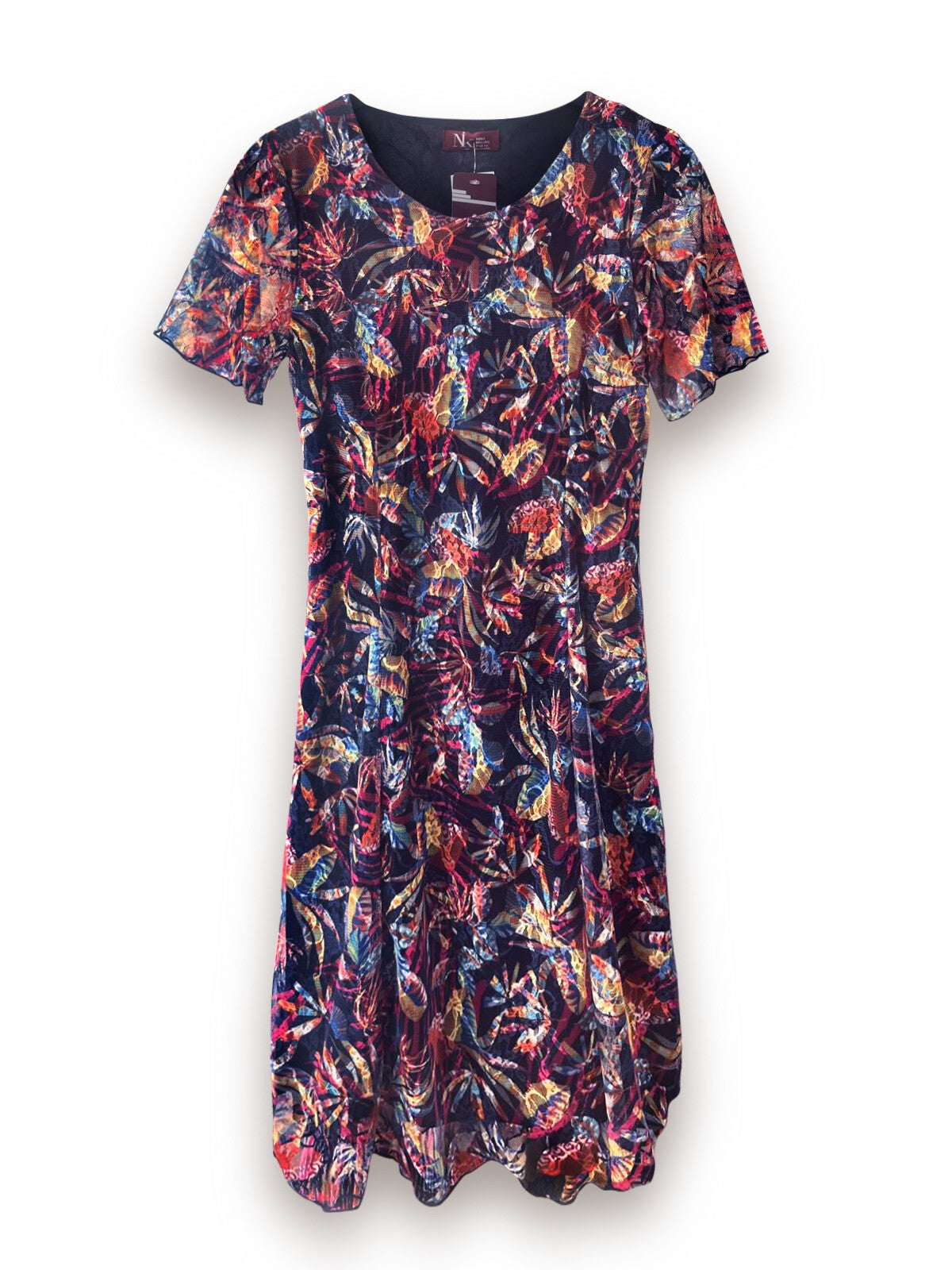 Son motif délicat et légèrement abstrait, évoquant des plumes ou formes organiques, lui apporte une dimension artistique subtile. Les nuances de bleu marine et rouge s’entrelacent avec justesse, pour une robe à la fois intense et délicate.