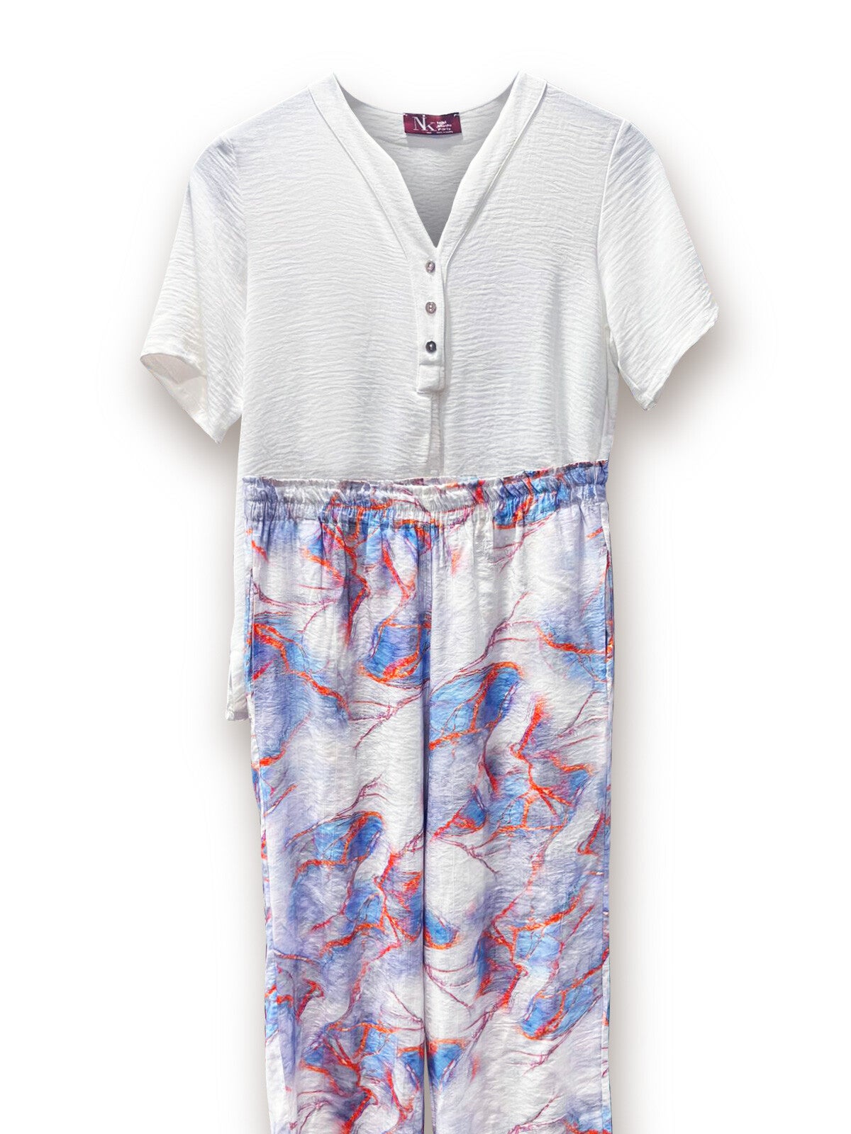 Cet ensemble deux pièces allie sobriété et fraîcheur avec un haut uni et un pantalon imprimé, parfait pour composer un look estival à la fois confortable et raffiné.