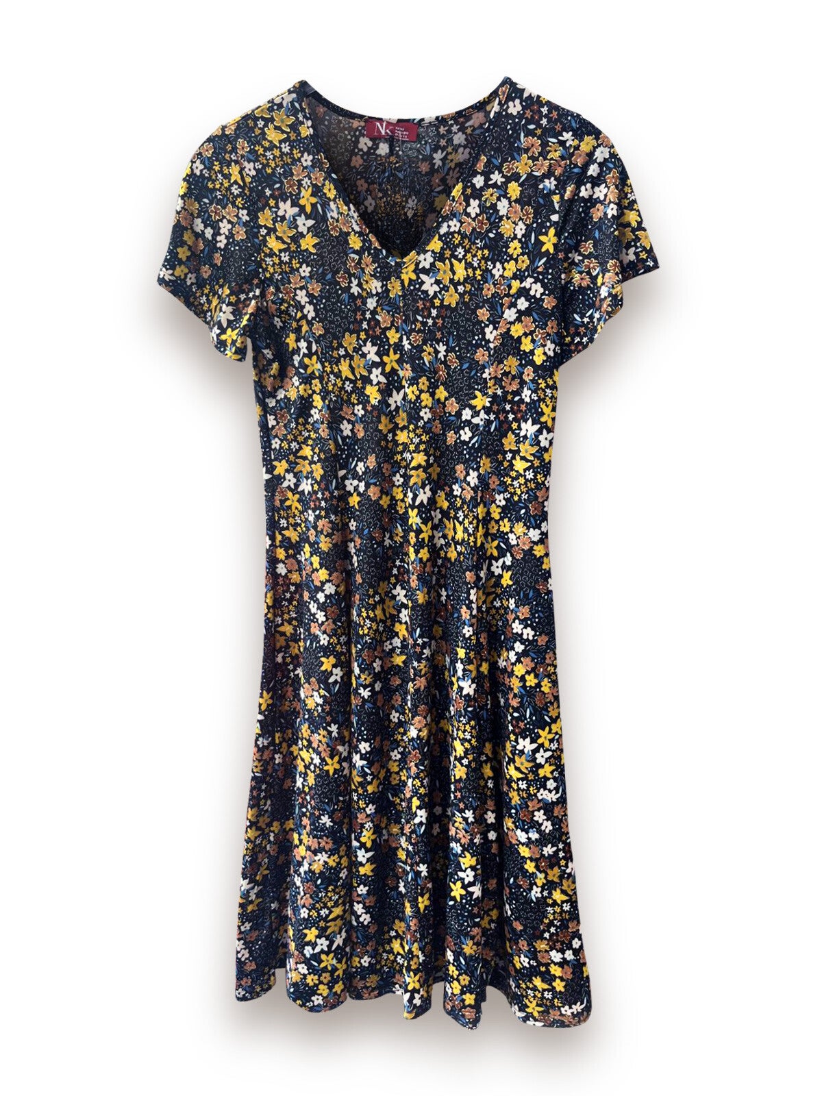 Son imprimé raffiné de fleurs dorées, jaunes et blanches sur un fond bleu marine profond apporte une note lumineuse et intemporelle, idéale pour toutes les occasions, du quotidien à une soirée d’été.